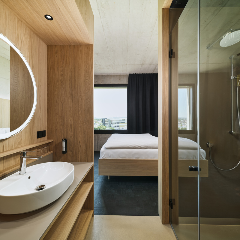 Our 63 units combine clean design with natural materials. Exposed concrete, wood, warm color accents, and a thoughtful lighting concept create a welcoming atmosphere.
